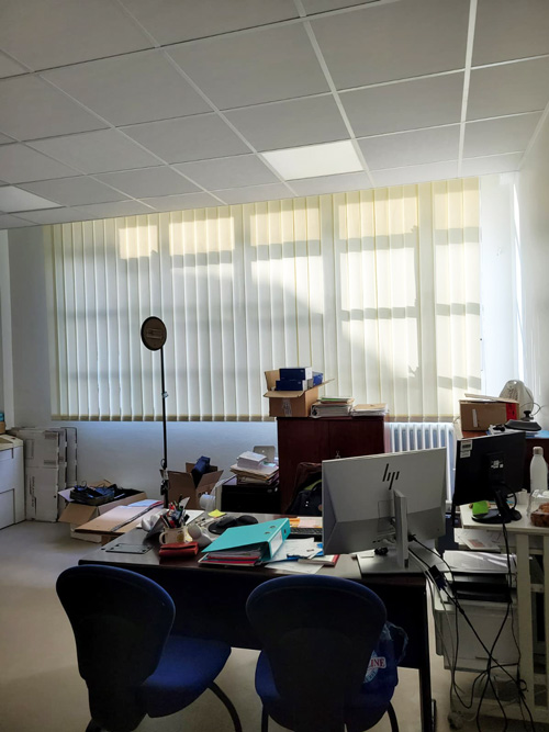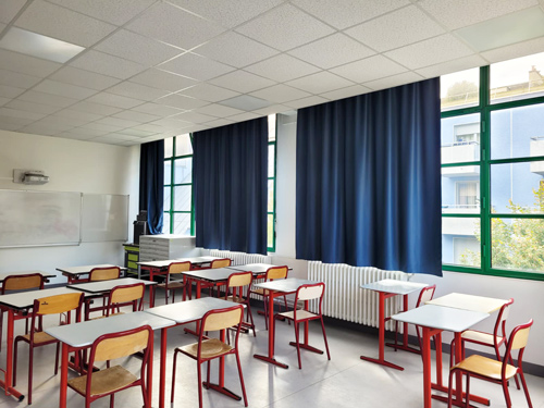 « Florian s’est déplacé rapidement, on a pris toutes les cotes, aucune n’était identique ! », raconte-t-il. Résultat : une dizaine de stores californiens installés dans les bureaux et pour les salles de classe, de nombreux rideaux occultants M1, répondant aux normes de sécurité incendie.